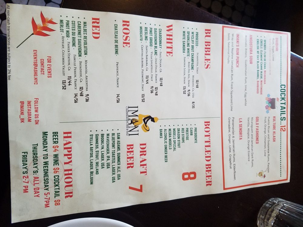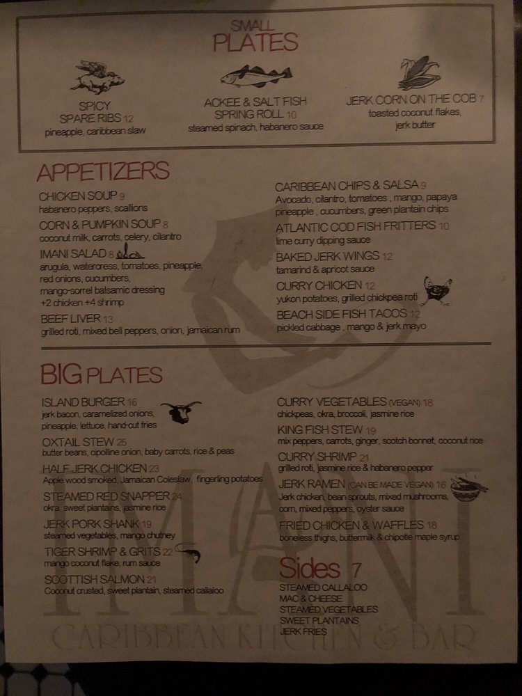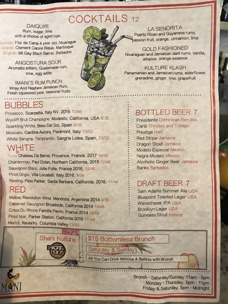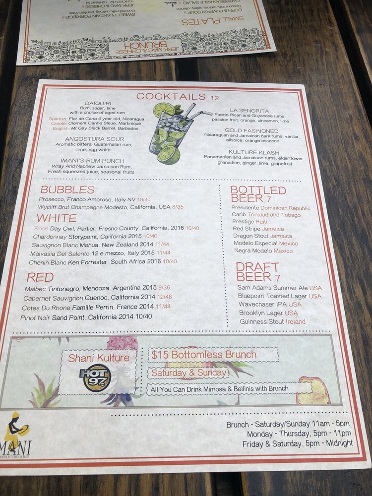 Imani, a Caribbean bar located at 271 Adelphi St Brooklyn, NY 11205, offers a diverse menu with vegan and vegetarian options. The restaurant provides an intimate, trendy, and romantic ambiance, perfect for various occasions. Customers rave about the flavorful dishes like fritters, reggae pasta, and curry chicken. The friendly staff and attentive service add to the overall pleasant dining experience. With a full bar, outdoor seating, and gender-neutral restrooms, Imani caters to a diverse range of customers. The menu includes a mix of Caribbean-inspired cuisine with a twist, making it a standout choice for brunch, dinner, and late-night dining. Despite some minor issues with consistency in drink strength, Imani remains a top choice for those seeking a unique culinary experience.
